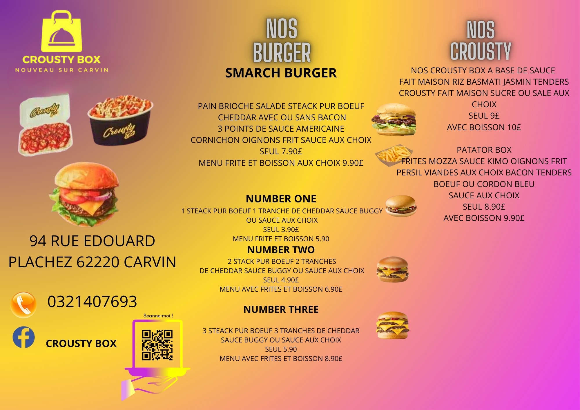 Embrace the warm ambiance and hospitality of Crousty box, located in Carvin. A heartfelt welcomes you! Come and enjoy yourself in our steakhouse. We can't wait to see you! Be prepared to be captivated by our delicious selection of french cuisine, italian cuisine, and mediterranean cuisine. Experience awesome dishes served by our friendly staff. Our flavoursome food await you! Bring your friends and family and enjoy them. If you have a sweet tooth, you will enjoy our delightful cakes and tarts, dessert, and tiramisu. Your dietary requirements matter to us, which is why we offer a selection of halal options. Refreshing fresh juice are also available to complement your meal. Our helpful servers are waiting to delight you with tasty lunch and dinner.